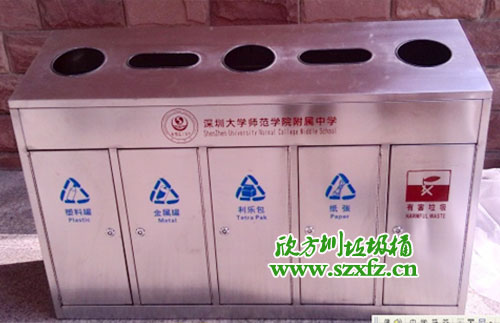 深圳師范學(xué)院附屬中學(xué)款式的C170五分類環(huán)保回收箱規(guī)格為:1600*400*860mm.外表是一款全新不銹鋼材質(zhì)打造而成.不銹鋼垃圾桶頂部有五個垃圾投放組合,圓形垃圾投口分別左,右,中間,還有兩個半圓在中間部位。不銹鋼垃圾桶正面開有五個門,每一個門前都有一個小鑰匙配套開門。正面中間橫幅有LOGO的標(biāo)準(zhǔn),還有深圳大學(xué)師范學(xué)院附屬中學(xué)字樣及英文拼音字母組合而成。不銹鋼垃圾桶五個取放垃圾內(nèi)膽正門,絲印有五個垃圾投放標(biāo)志。從左到右依次回收塑料罐,金屬罐,利樂包,紙張,有害垃圾及標(biāo)志。不銹鋼垃圾桶外觀為方形,具有獨特的堅固耐用,不易破損;耐火安全,抗高低溫等優(yōu)勢。適合各大院校,高檔場所使用。