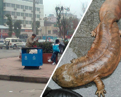 成都火車站環衛垃圾桶爬出娃娃魚驚呆市民