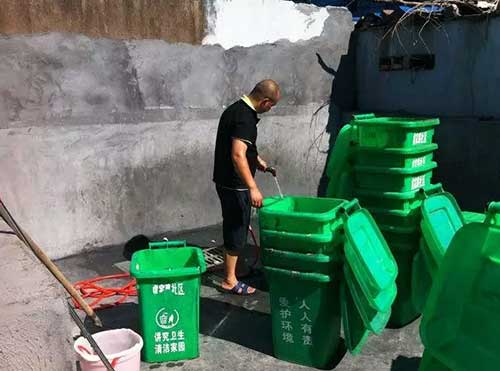 前天上午8點(diǎn),金棉小區(qū)廢棄籃球場(chǎng)的東南角就響起了一陣陣沖洗聲,清潔人員劉師傅拿著水管沖洗著一只只垃圾桶,邊上一排晾著幾十只剛洗干凈的垃圾桶。這些垃圾桶都是早上從小區(qū)里收集來(lái)的,洗干凈晾干后,第二天去替換其他臟的垃圾桶。